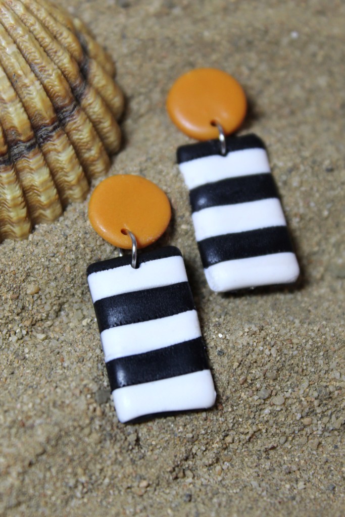 Pendientes rectangulares con estampado a rayas marineras y círculo pegado a la oreja en color naranja.