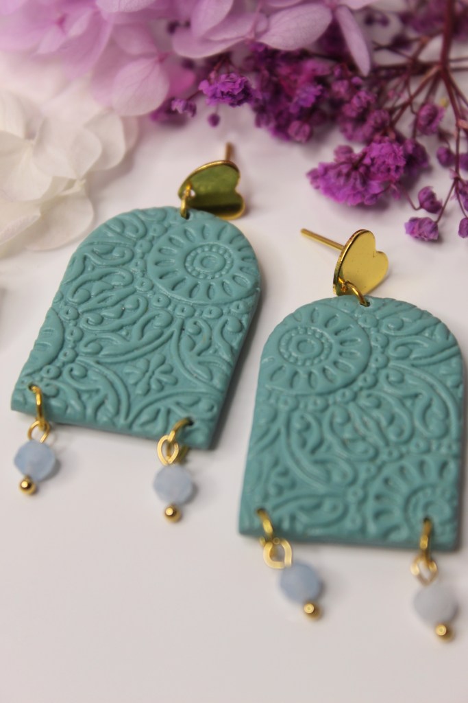 Pendientes con forma de ventanal con textura, botón dorado en forma de corazón y piedras aguamarina.