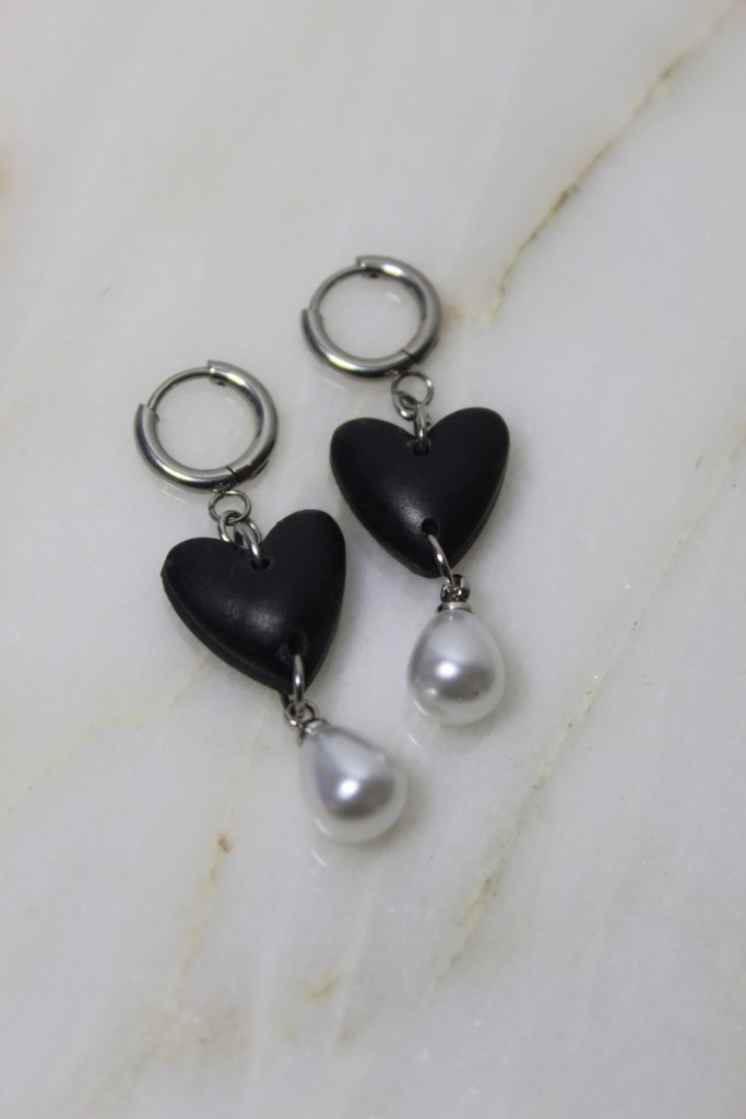 Pendientes con forma de corazón fluffy, aro plateado y lágrima de perla.