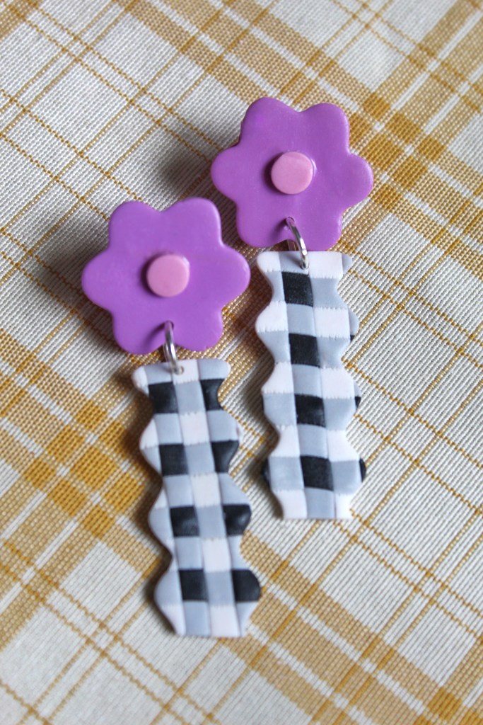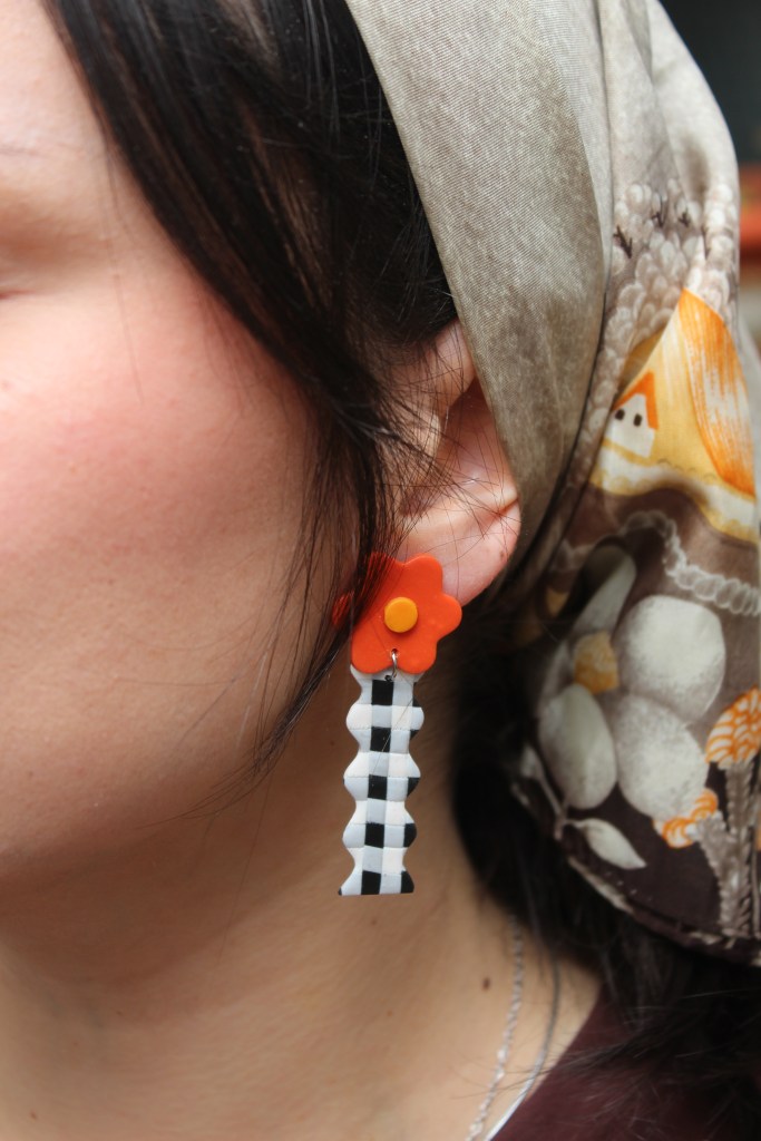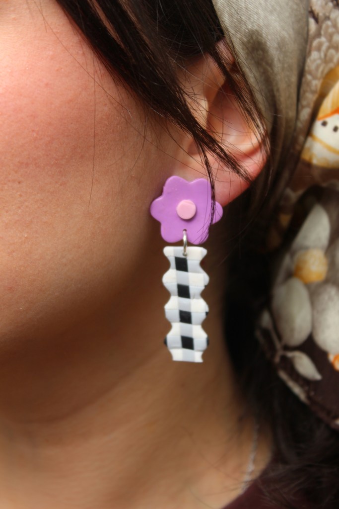 Pendientes en forma de flor pegada a la oreja y estampado vichy, disponibles con flor naranja y con flor lila.