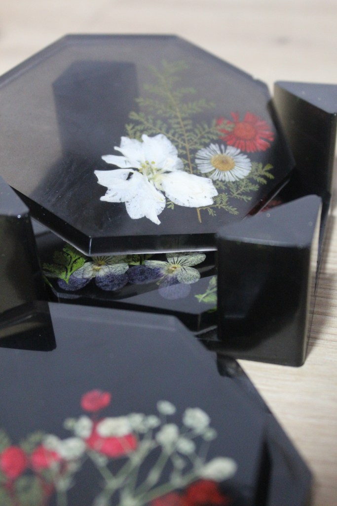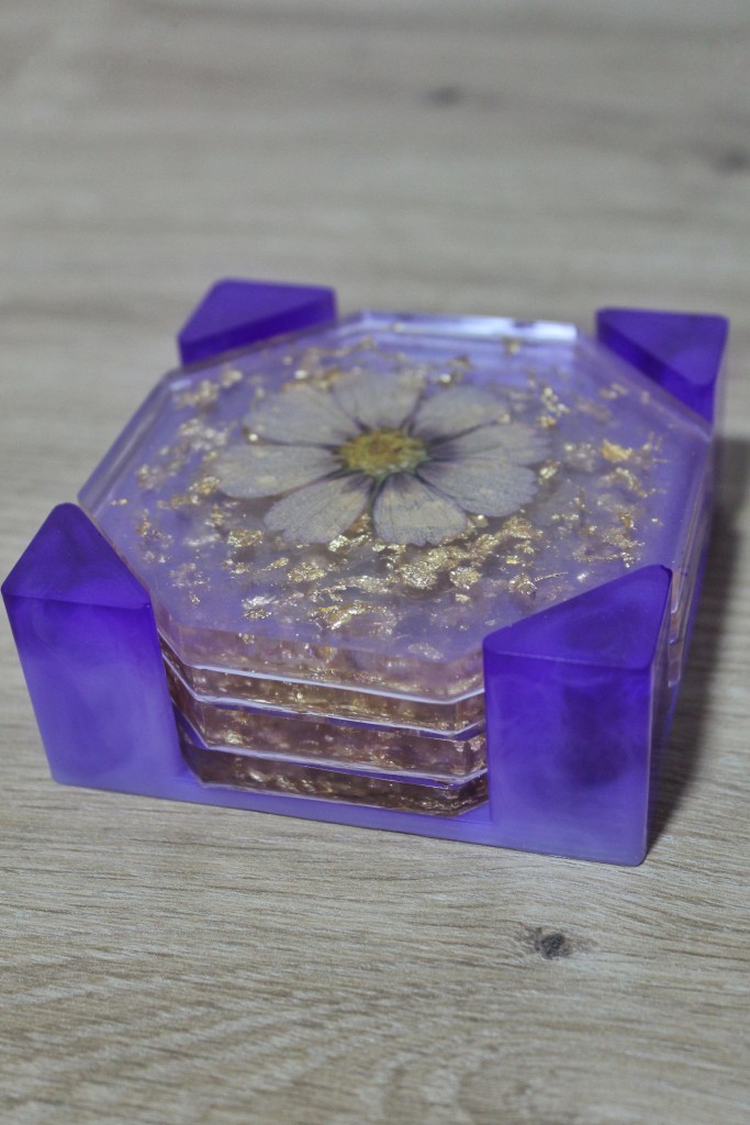 Posavasos fabricados en resina con diferentes colores y decoración.